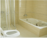 沖淋房底座無(wú)積水,排水管彩用硬管連接,沖淋房的玻璃采用安全鋼化玻璃,與墻體結(jié)合部無(wú)滲漏現(xiàn)象